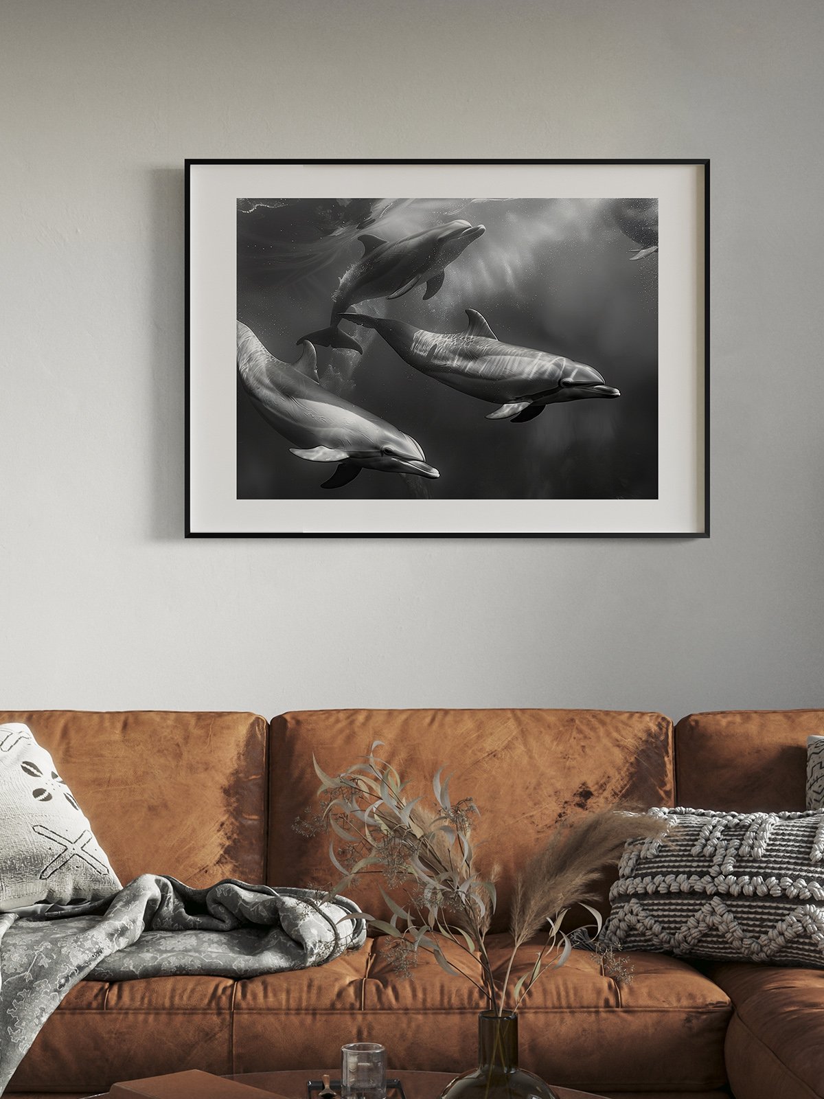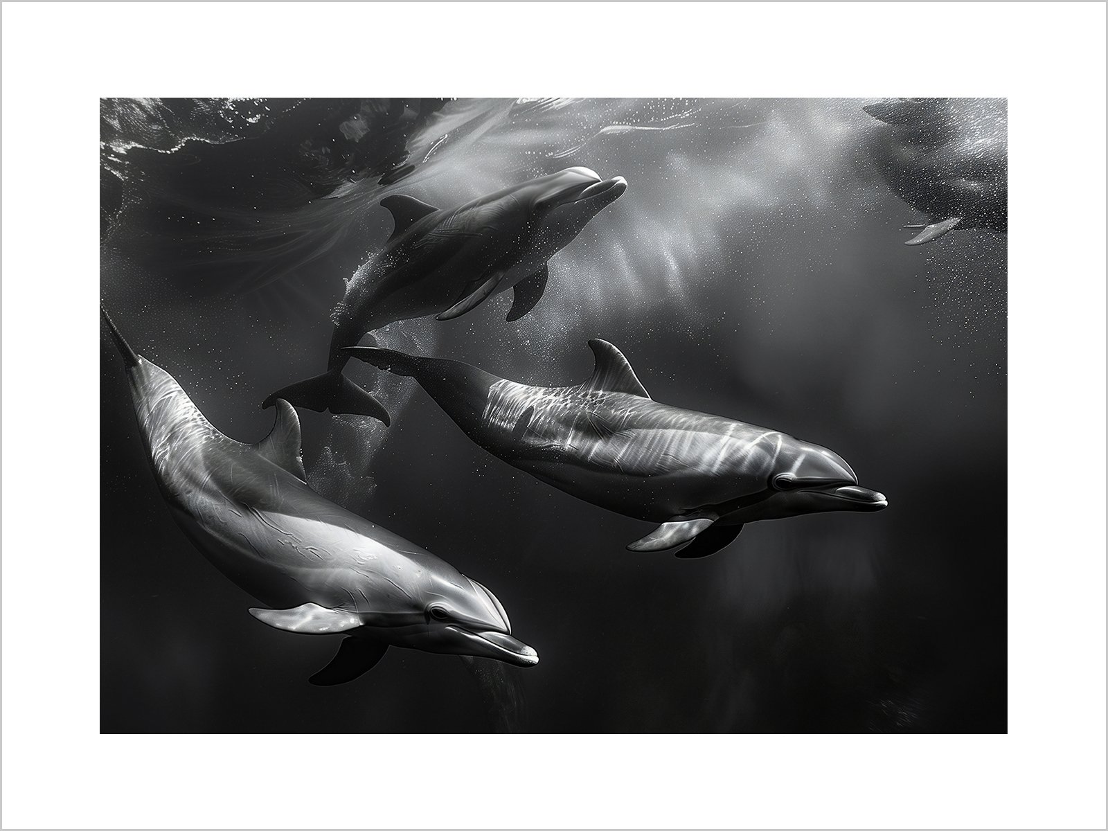 This black-and-white photograph captura several dolphins swimming gracefully underwater. Luz filters through the water’s surface, highlighting their suave lines and elegante postures. The dolphins appear particularly lively in the oscuro agua, gustar spirits of the océano. The entire piece uses luz and sombra to crear a tranquil and mysterious atmosphere, immersing the viewer in the profundidad and beauty of the mar.