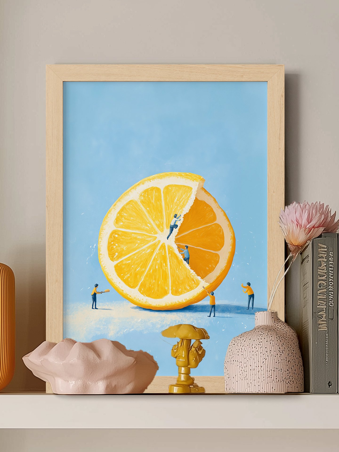 Una gran rodaja de naranja se abre mientras pequeñas figuras colaboran y se ayudan. El contraste entre el naranja brillante y el fondo azul transmite frescura, vitalidad y un alegre espíritu de cooperación.