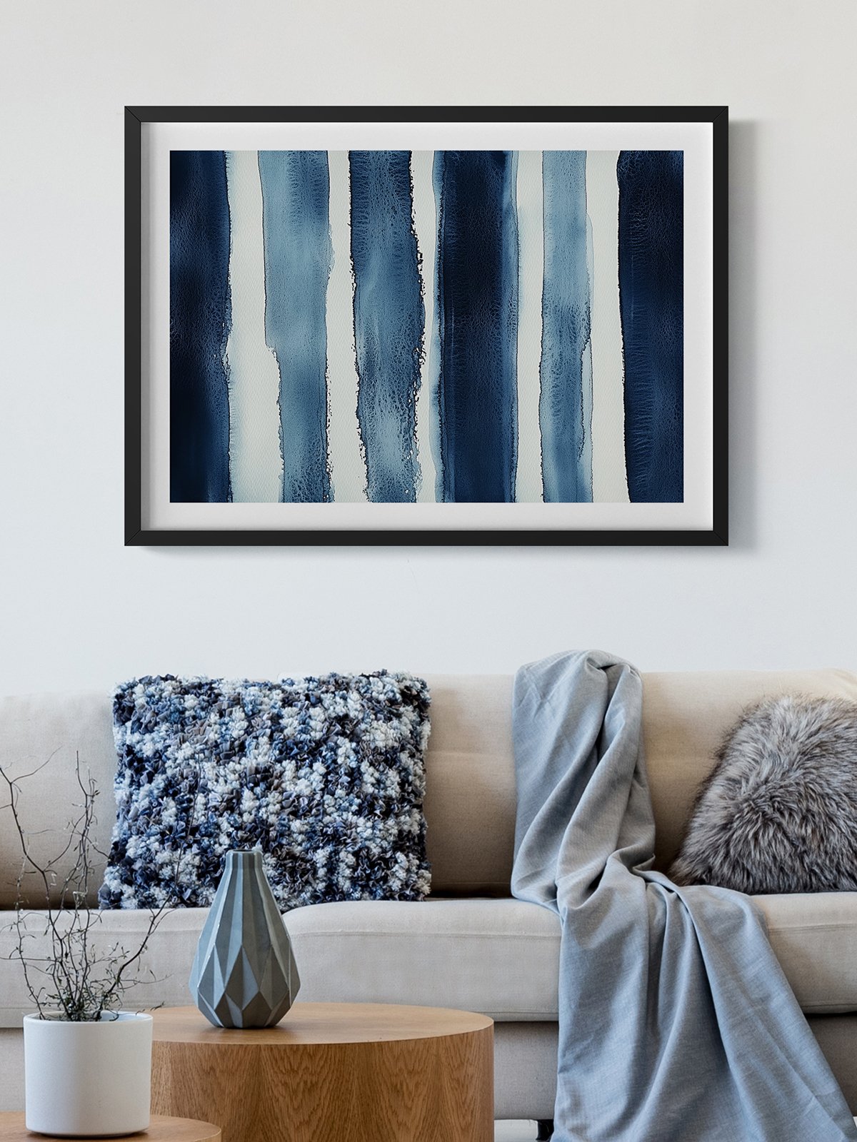 Vertical streaks of varying blue shades flow gustar the ritmo of waves across paper¡ªminimal yet poderoso. The composición evokes a sentido of quiet orden and fluid motion, as if escuchando to a suave blue symphony.