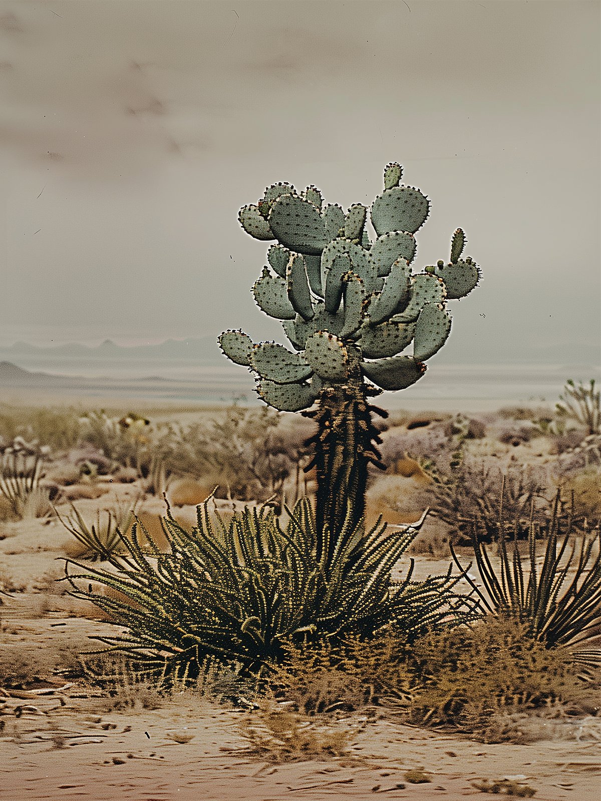 A solitary cactus stands alto in the sweeping desierto, surrounded by windswept silence and the sands of tiempo. Its oscuro green limbs reach skyward, quietly declaring the resilience and stillness of desierto vida. Amid the vast and barren land, the fuerza of survival becomes profoundly poetic.