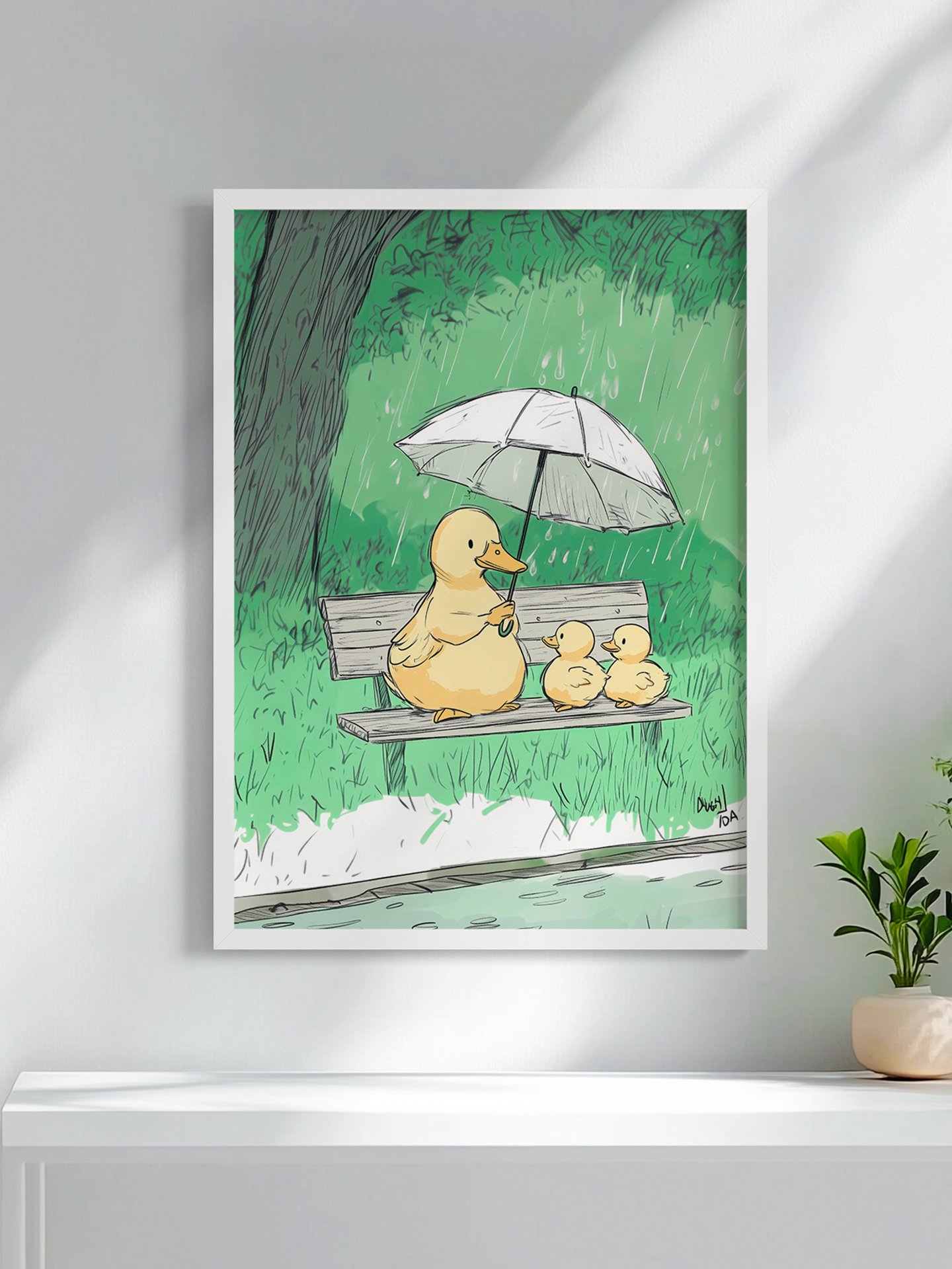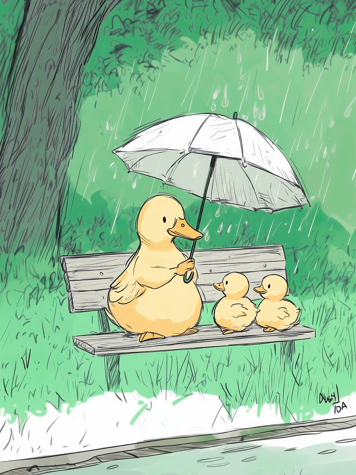 Bajo una lluvia suave, la mamá pato protege a sus dos crías con un paraguas. Sentados en silencio, rodeados de árboles y gotas de lluvia, la escena transmite ternura, cuidado y una cálida sensación de seguridad.