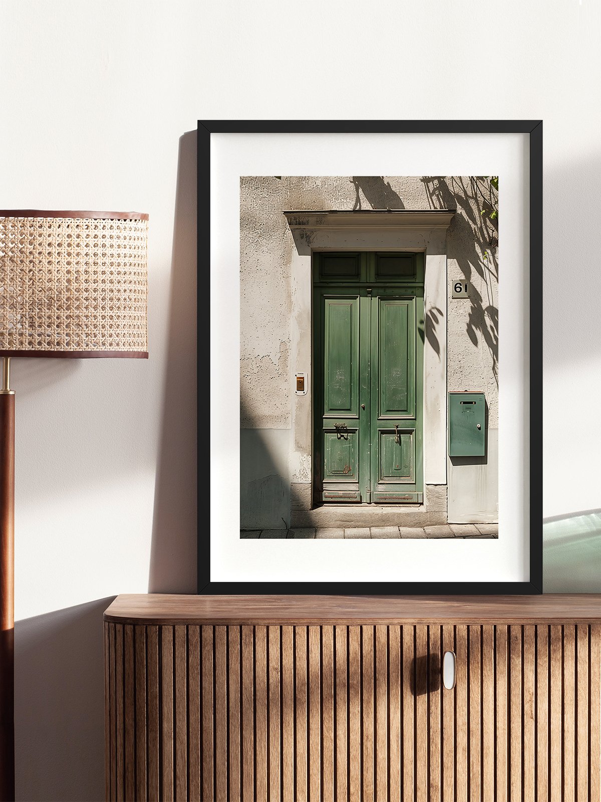 This photograph features an viejo green wooden puerta with visible signs of aging, irradiando a sentido of vintage encanto. Luz solar bathes the puerta, añadiendo calidez and tranquilidad, as if narrating stories of the pasado.