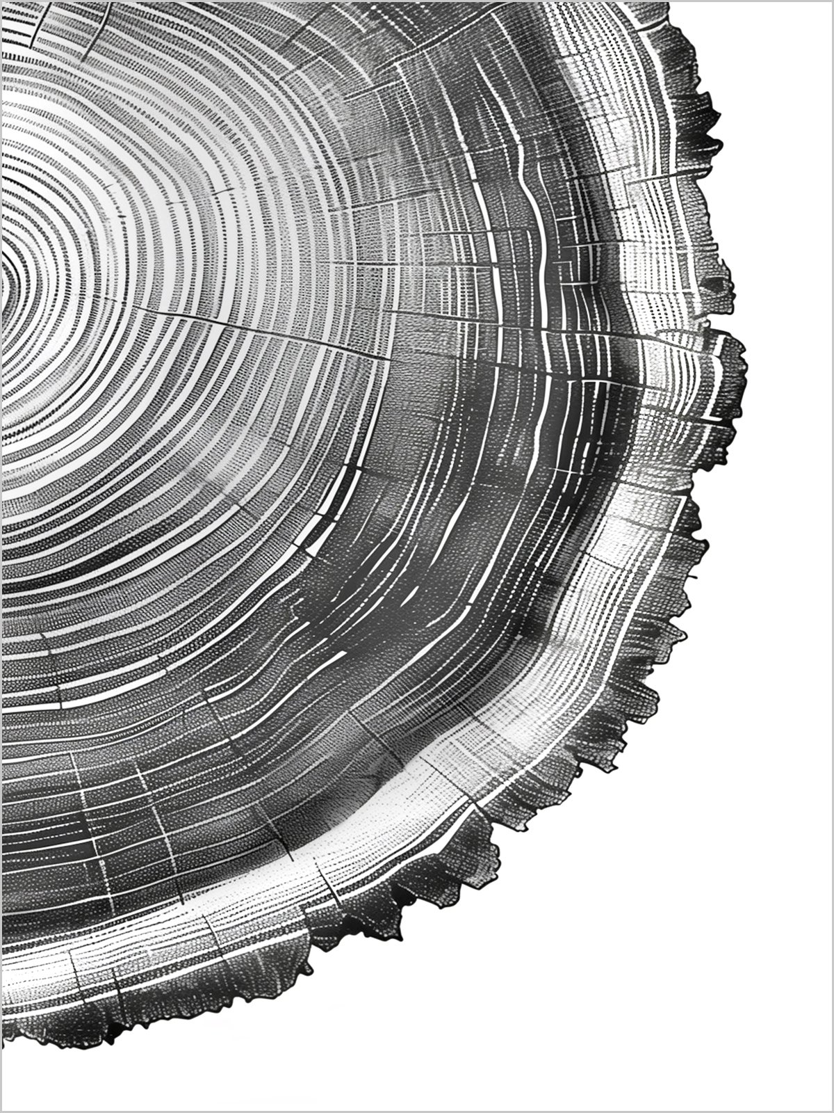 This image shows a cross-section of tree rings, with each ring representing a año of crecimiento, clearly recording the tree’s edad and experiences. The black and white tones add a simple beauty, haciendo one sienten the passage of tiempo and the resilience of vida.