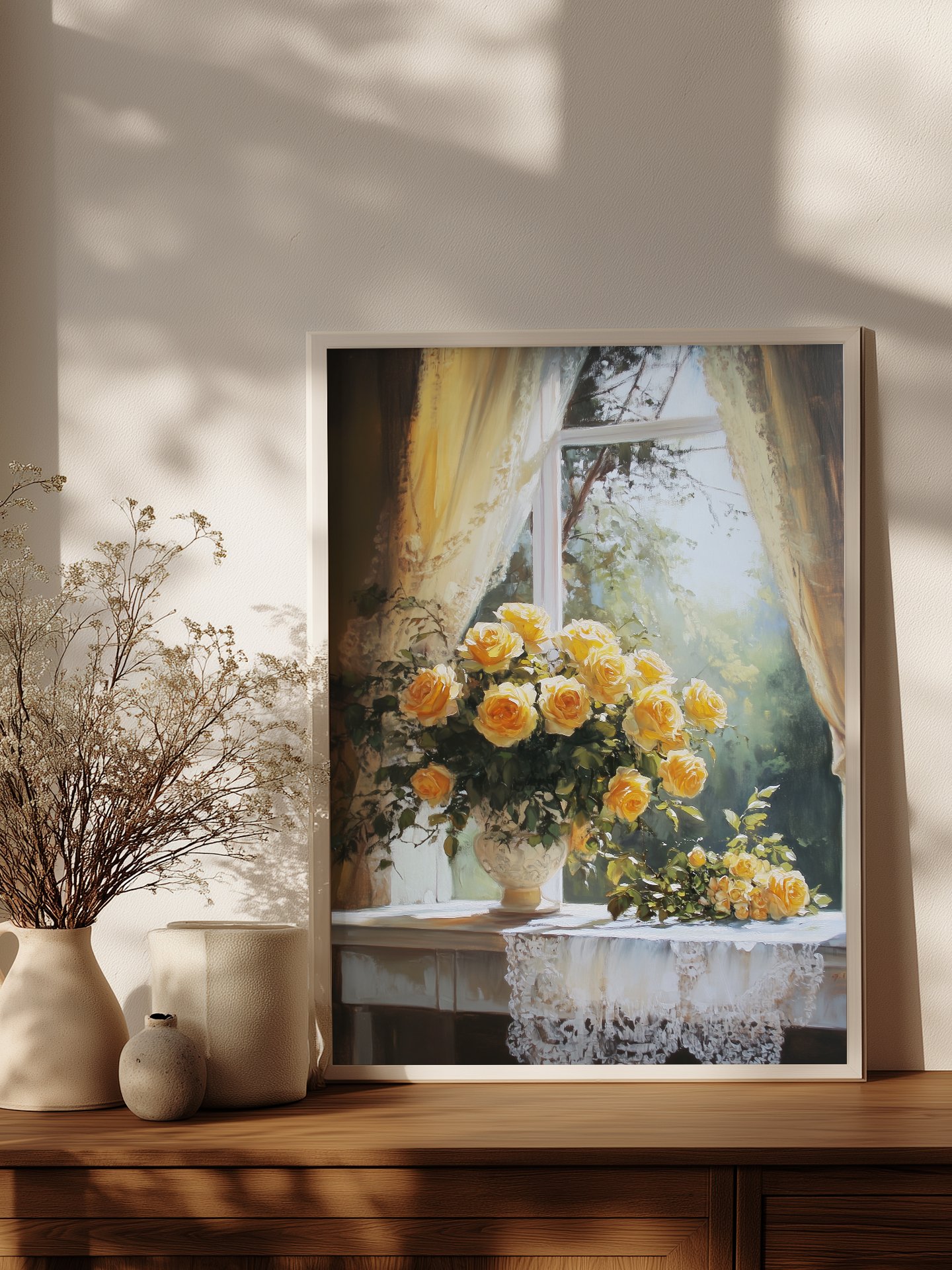 Esta pintura muestra un ramo de rosas amarillas en flor en un jarrón en un alféizar de ventana, con exuberante vegetación afuera. La luz del sol se filtra a través de las cortinas, proyectando un cálido resplandor sobre las flores, creando una atmósfera serena y acogedora. El mantel de encaje añade un toque de elegancia y refinamiento.