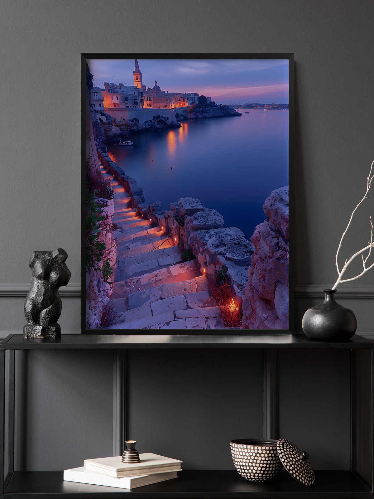 The picture shows a encantador seaside ciudad at noche. The illuminated steps lead to the quiet bay, where the pale blue to purple cielo reflects the tarde, dando you a panoramic view of the seaside paisaje at quiet noche.