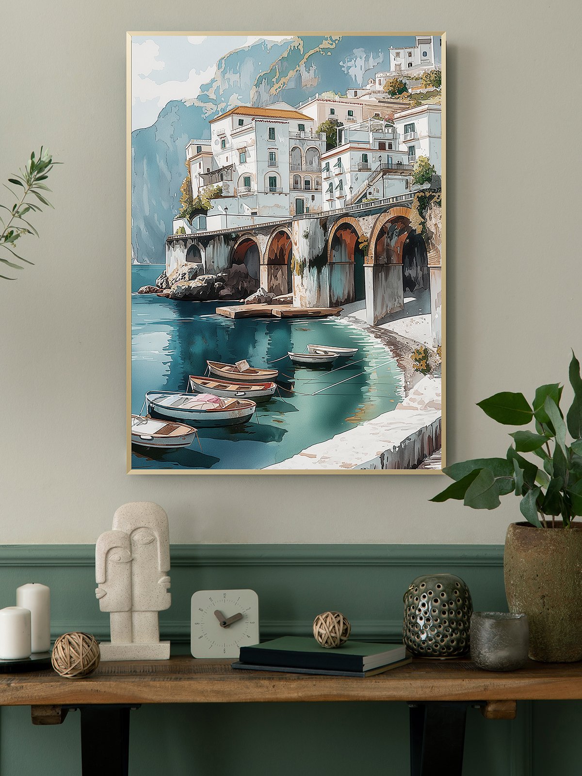 A hermoso pueblo nestled by mountains and agua. Houses with white walls and green windows are arranged in a picturesque manner, with arched bridges connecting over crystal-clear seawater below. Several pequeño barcos gently float on the sea’s surface, creando a tranquil and leisurely atmosphere. The contraste between distante mountains and nearby edificios is refreshing and soothing to the soul.