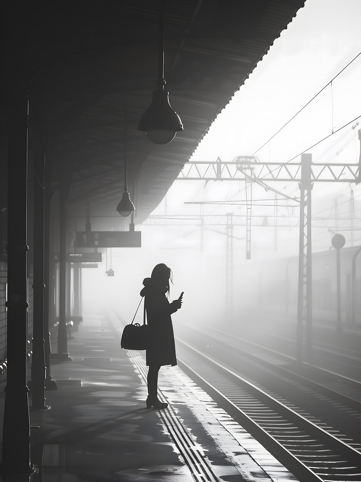 On a snowy platform, a woman’s atrás stands on the bank of the railway, her coat and hat outline her elegante silhouette. The handbag is held tightly in the hand, which seems to imply an desconocido viaje. The luz penetrates the mist, añadiendo a touch of tranquilidad. While waiting, the railroad tracks meet the years.