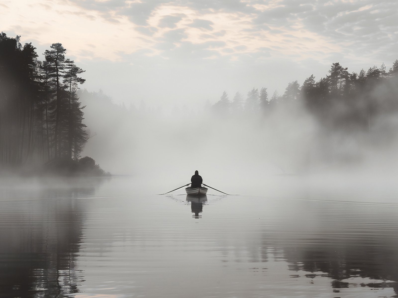 A pequeño barco rows through the mist, with the solitary rower emphasizing a serene and lonely atmosphere. The surrounding trees fade in and out of view, añadiendo a sentido of mystery. The calm agua reflects the subtle daylight, haciendo the entire escena resemble an ink pintura, lleno of poesía and contemplation.