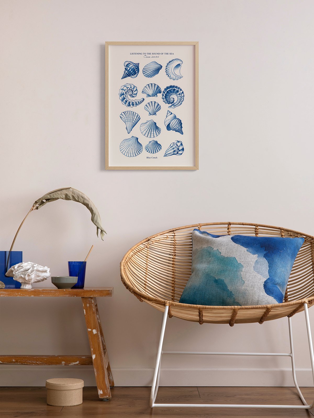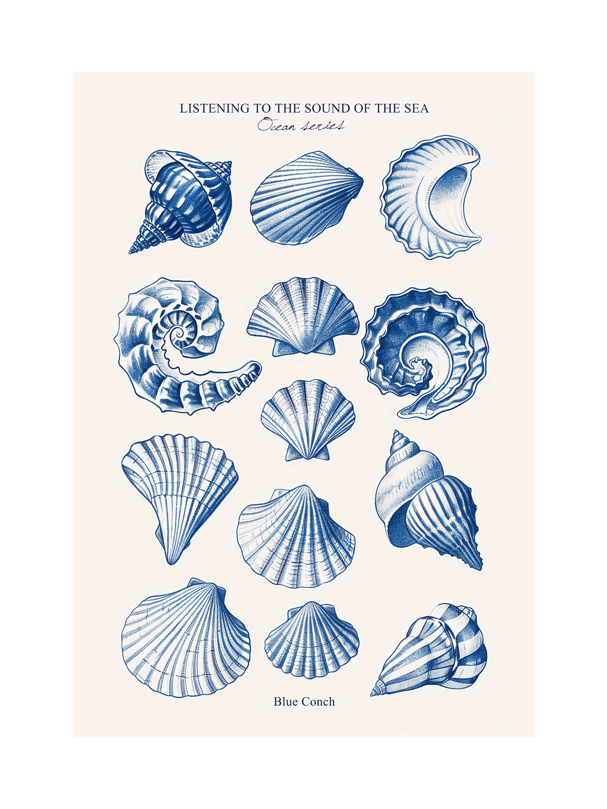 This artwork features a variedad of uniquely shaped seashells, with intrincados details outlined in blue. The orderly arrangement of the shells evokes a sentido of natural beauty and tranquilidad. The image brings to mind the sounds and memories of the seaside.