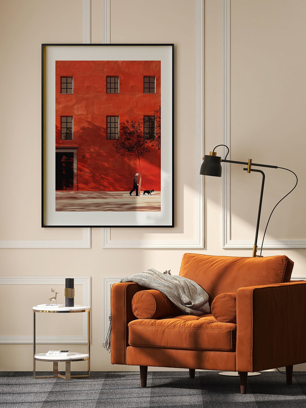 Luz solar washes the naranja wall as tree shadows sway gently in the breeze. An viejo hombre and his black dog pasean by, infusing a simple escena with quiet calidez and poetic serenidad.