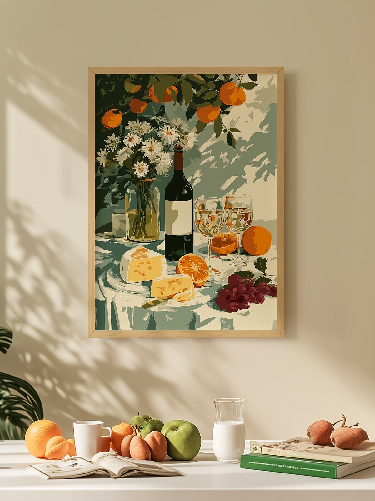 Luz solar pours over a table adornadas with wine, cheese, oranges, and a vase of flowers, creando a cálido and suave color paleta. The aire seems filled with the scent of citrus and wine, evoking a lazy, encantador verano tarde atmosphere.