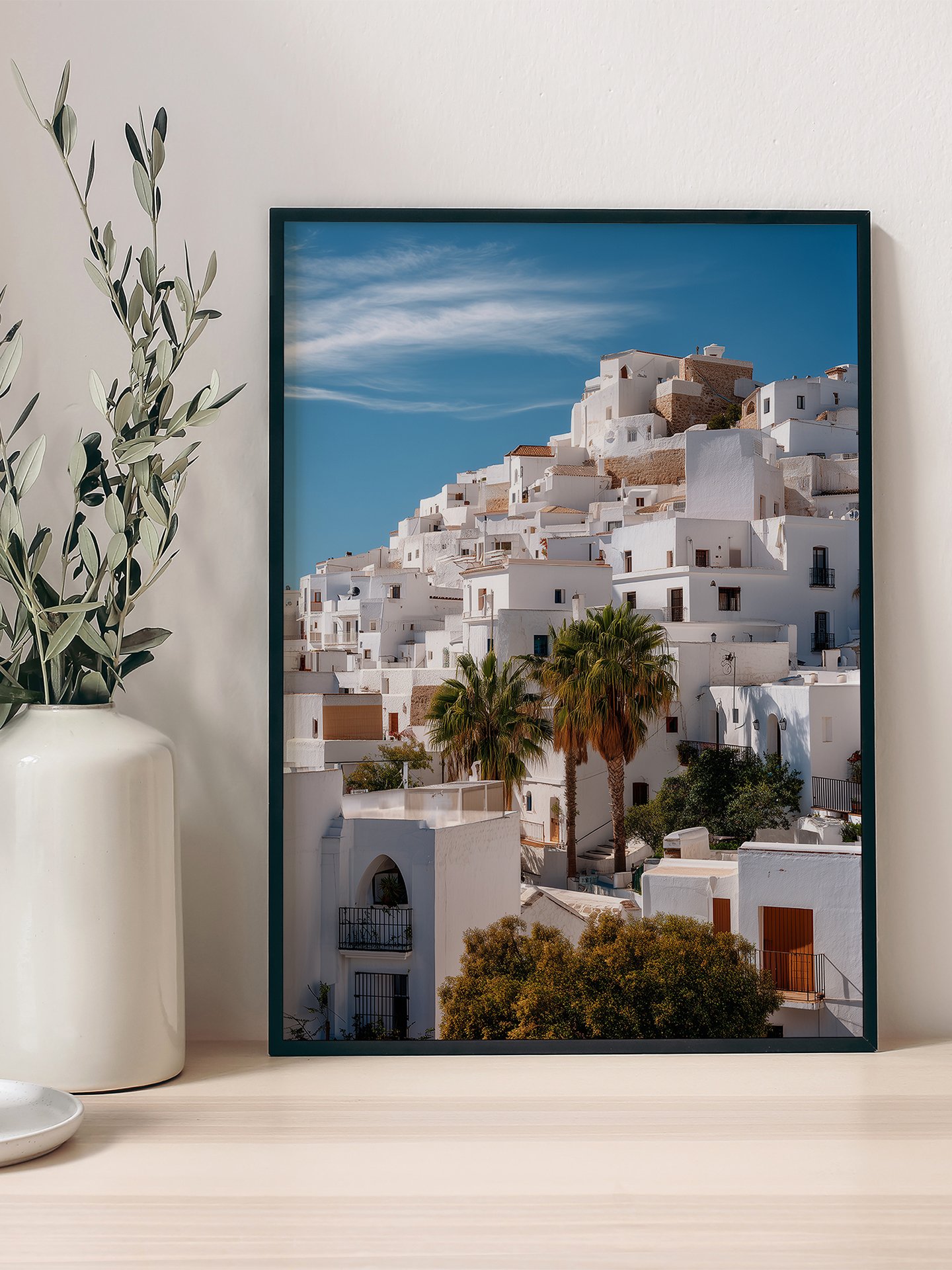 This trabajar representa terraced white houses of the pueblo under a vivo blue cielo. Palm trees and vegetación add vitalidad, while afilado contrasts of luz and sombra highlight Andalusia¡¯s brilliance.