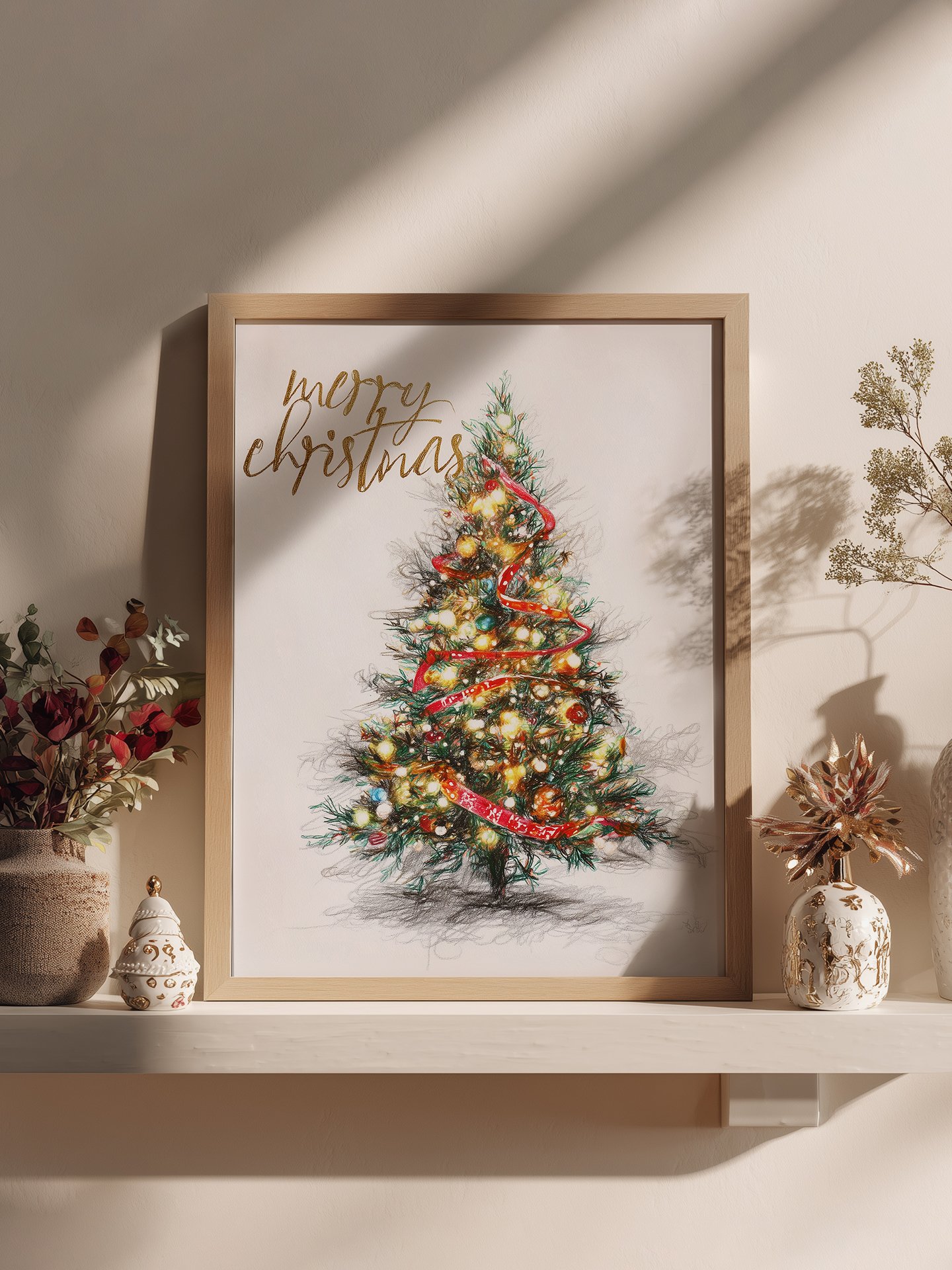 The pintura shows a hermosamente decorated Christmas tree, adornadas with glowing dorado lights, colorful ornaments, and a rojo ribbon spiraling around its branches. The limpio fondo highlights the tree¡¯s brilliance, creando a cálido, festive atmosphere that conveys the alegría and blessings of Christmas.