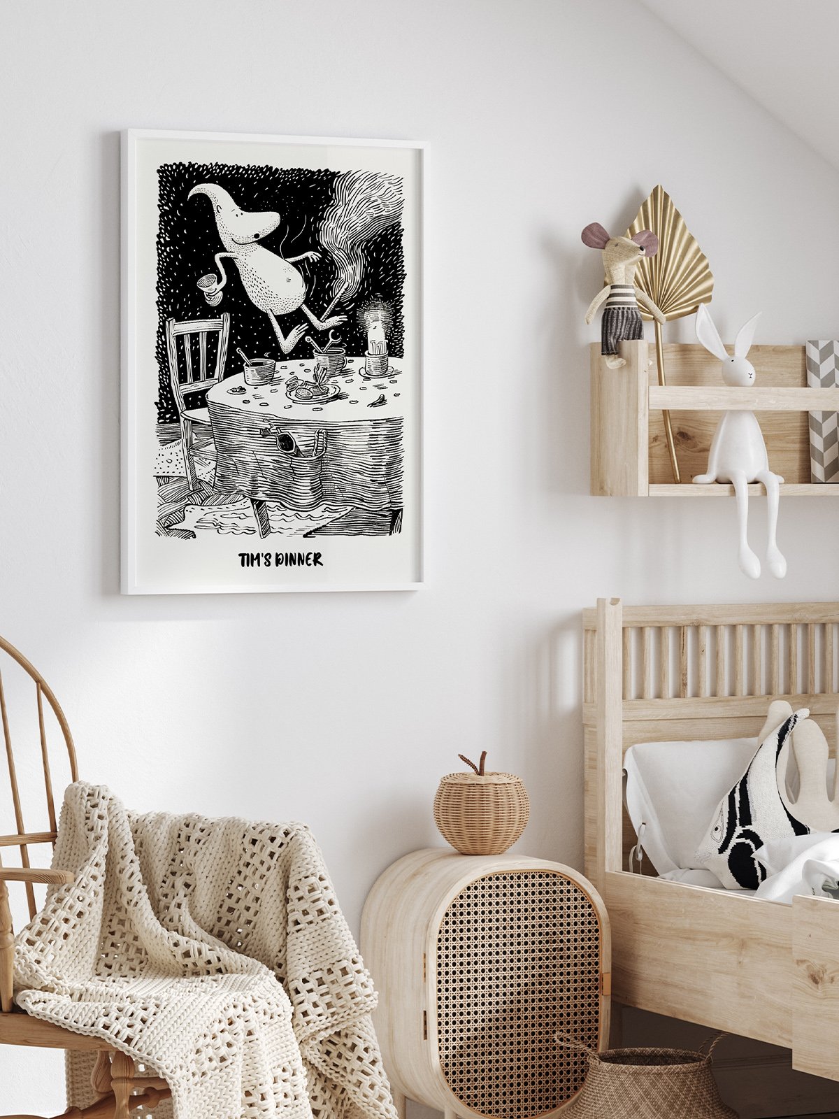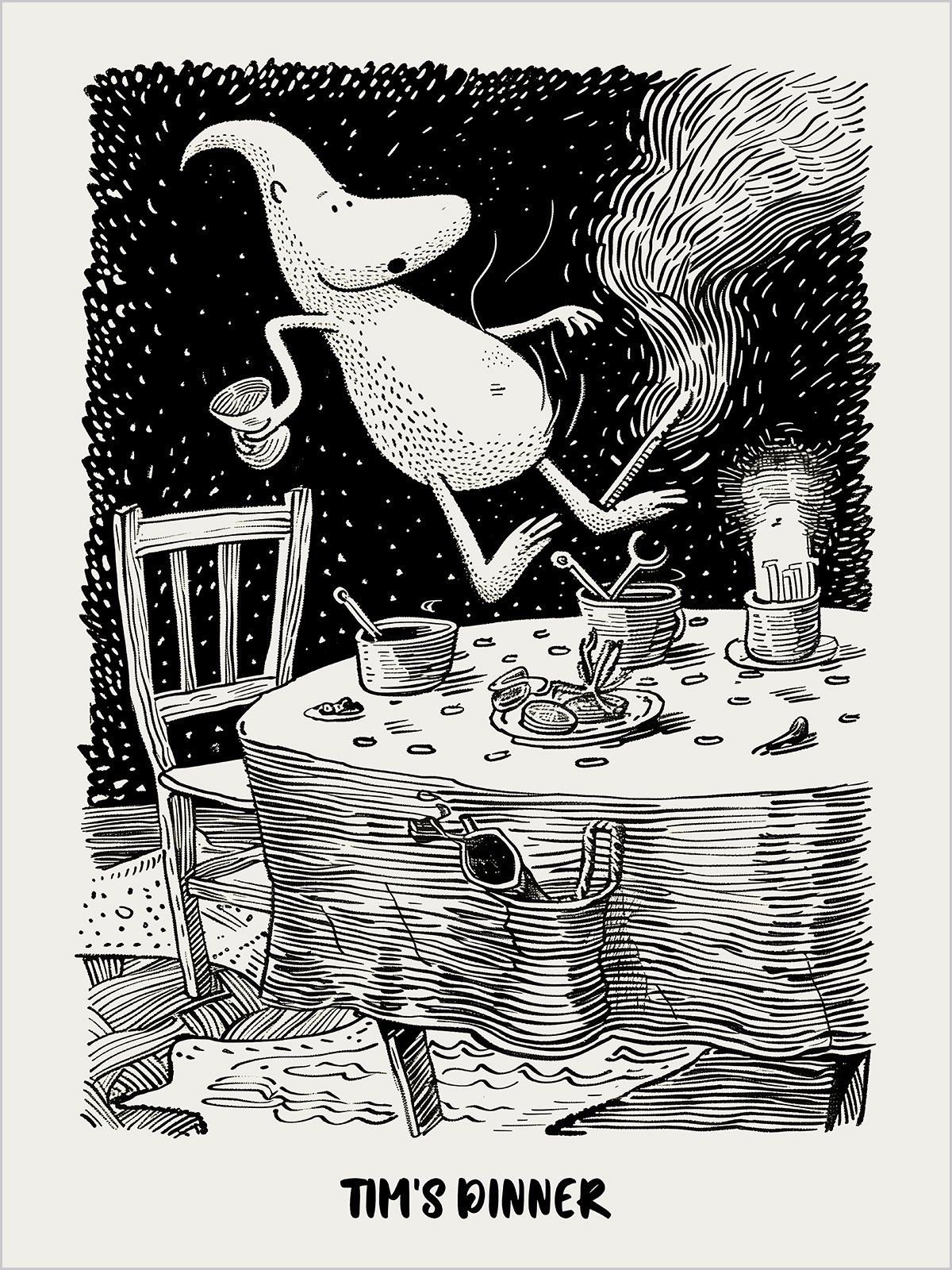 This image representa a fantastical dinner escena. A quirky character dances beside a table set with various utensils and comida, contra a fondo of a starry cielo. The overall picture is filled with humor and fantasy, haciendo los espectadores smile.