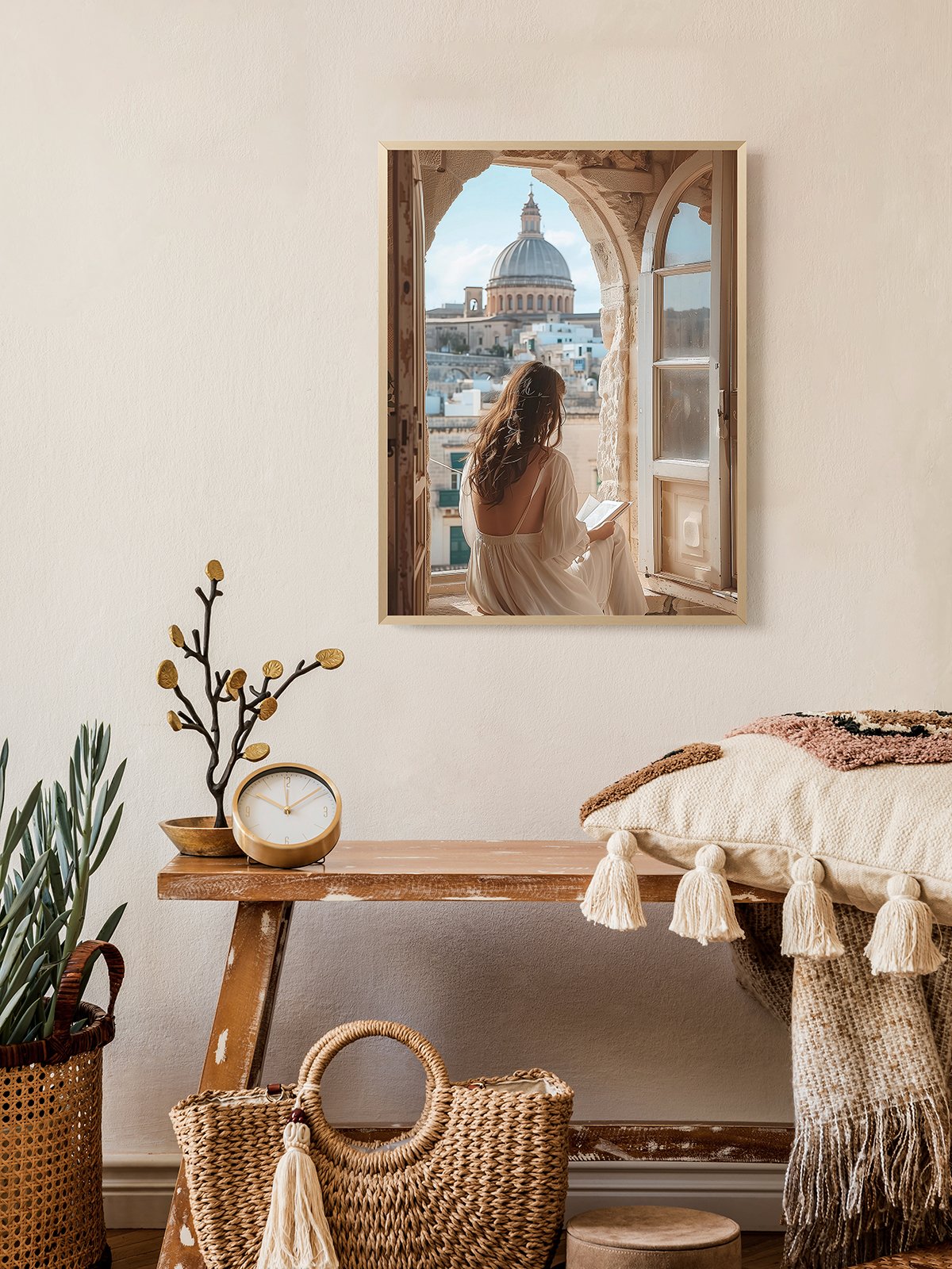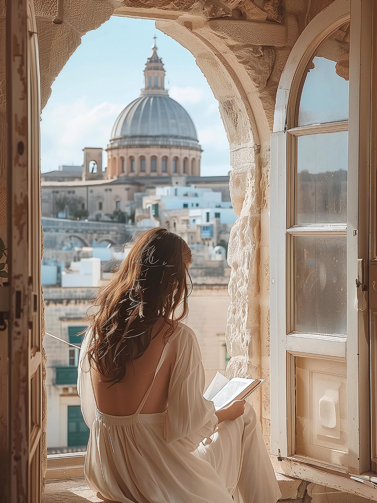 A mujer dressed in a flowing white gown sits gracefully by a picturesque ventana, leyendo. Afuera the ventana is a historic cityscape, illuminated by suave natural luz that highlights the majestic con cúpula construyendo, añadiendo a sentido of grandeza and timeless beauty. The tranquilidad of this momento perfectly expresses a mood of quiet reflection and relaxation.