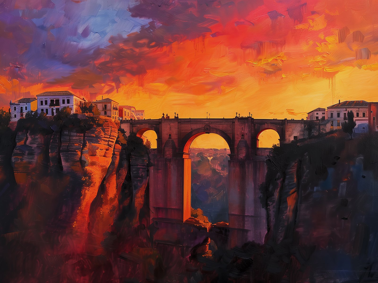 Esta pintura al óleo se centra en el paisaje del puente al atardecer, donde el sol anaranjado tiñe el cielo con un degradado de rojo y púrpura. El puente y los edificios reflejados en el agua se entrelazan en el juego de luz y sombra, con pinceladas gruesas y colores intensos transmitiendo una atmósfera vibrante, como si se pudiera tocar la calidez del atardecer y el movimiento de la luz.