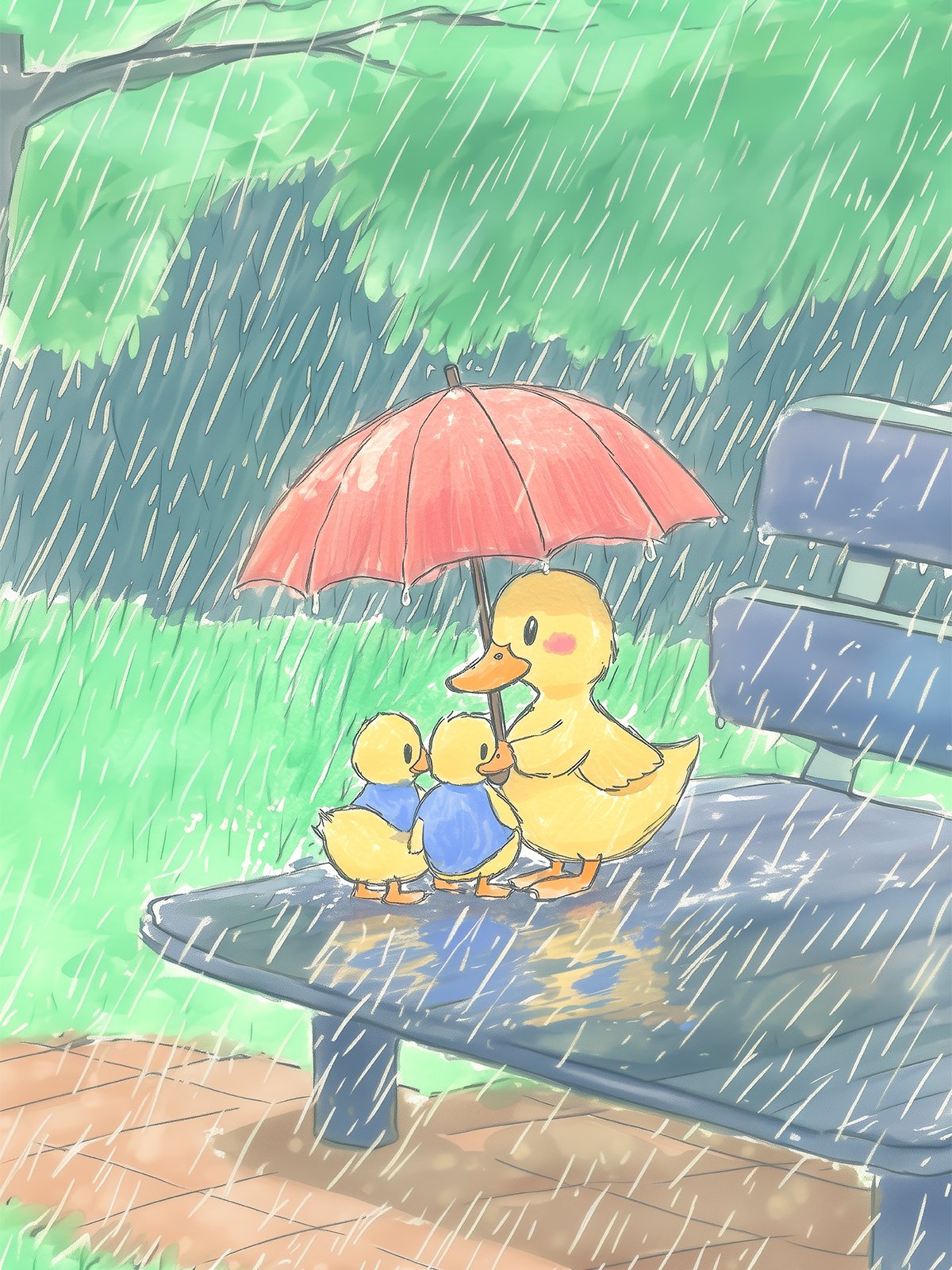 Bajo la lluvia intensa, la mamá pato protege a sus dos patitos con un paraguas rojo. El banco mojado refleja una escena llena de ternura, cercanía y una cálida sensación de amparo.