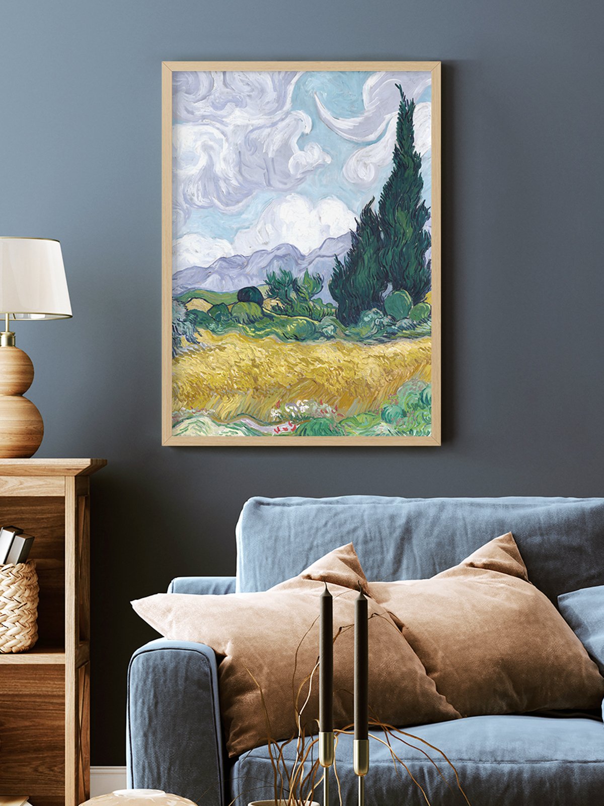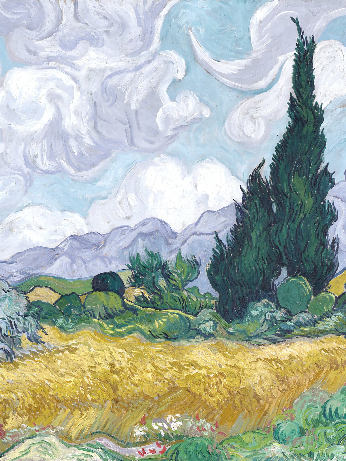 El cuadro “Campo de trigo con cipreses” de Van Gogh representa una escena de campos de trigo dorados y cipreses frondosos meciéndose con el viento. En el cielo azul, las nubes blancas parecen danzar, creando una sensación de tranquilidad y vitalidad a la vez. Es una perfecta representación de la belleza y la vitalidad de la naturaleza, que permite al espectador experimentar la inmensidad y la abundancia del mundo natural.