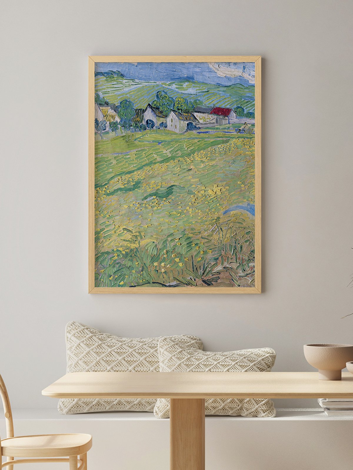 El cuadro “Paisaje en Auvers-sur-Oise” de Van Gogh representa la serena campiña francesa. En la pintura, los campos verdes y las flores amarillas se complementan, mientras que el pueblo a lo lejos y el cielo azul con nubes blancas crean un paisaje idílico, que evoca una sensación de paz y armonía con la naturaleza.