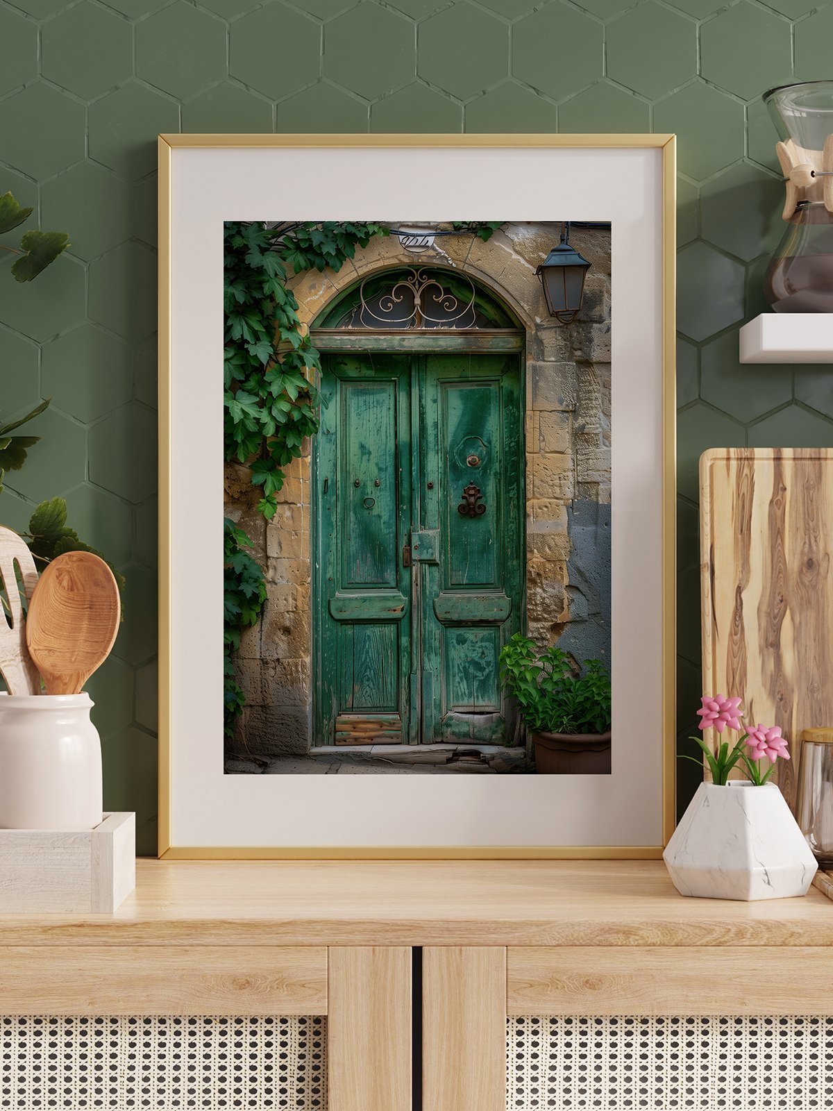 An viejo green wooden puerta, surrounded by climbing green vines, exudes an antiguo and mysterious aura. The wrought iron decorations and weathered puerta panels contar tales of tiempo, while the surrounding stone walls and viejo lantern add a sentido of enduring historia.