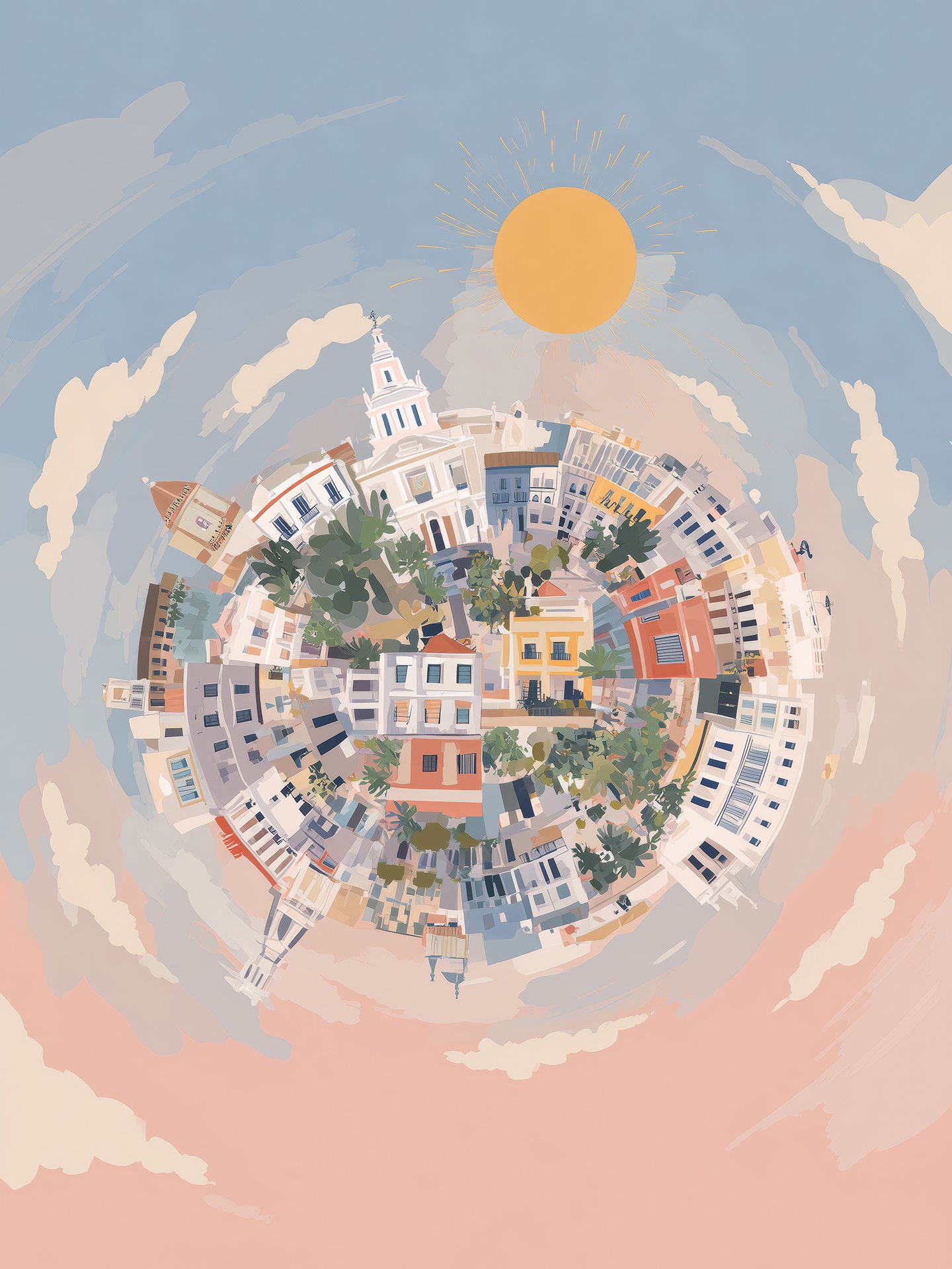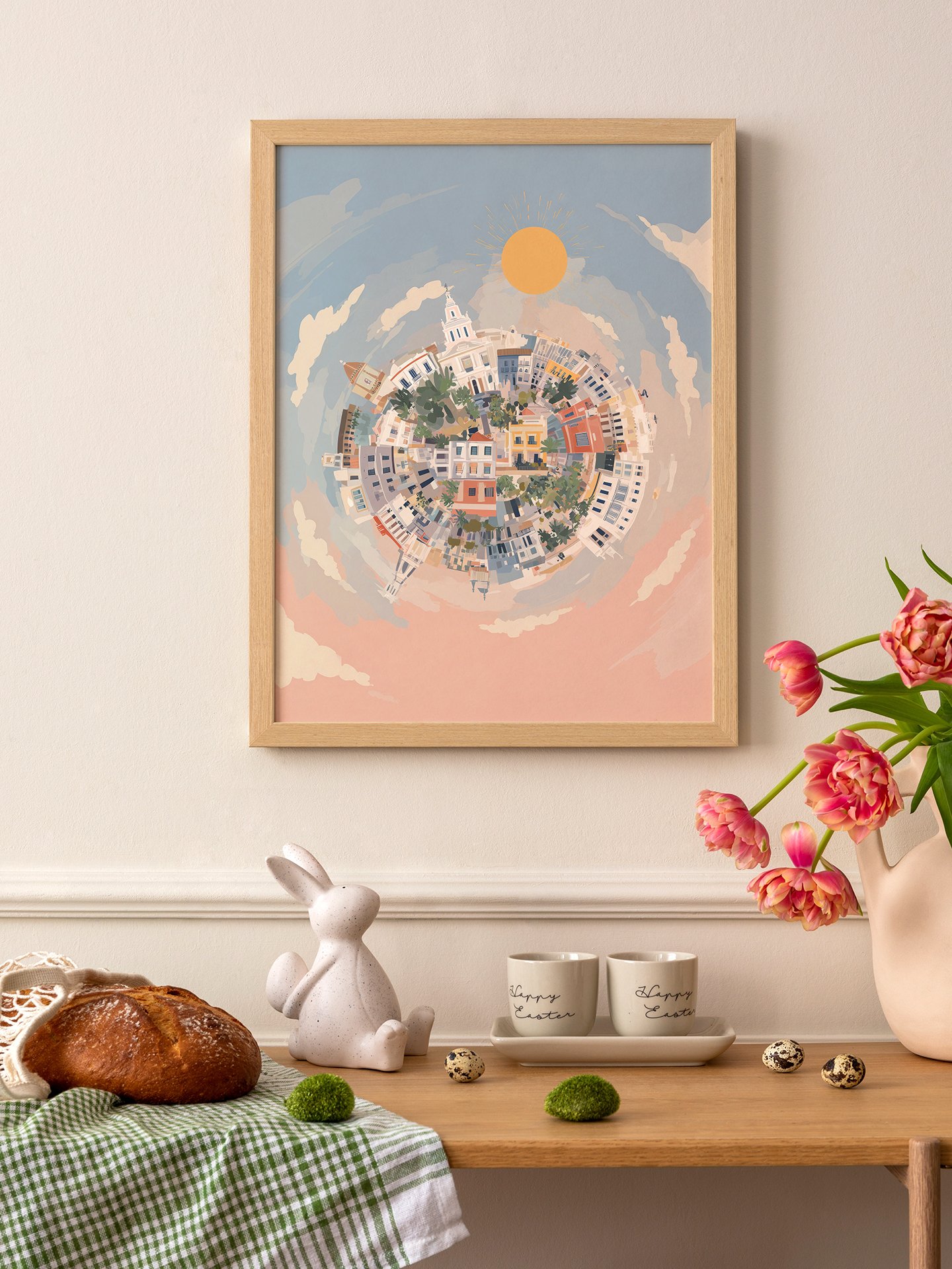 La obra presenta tonos cálidos, con una composición circular. Un sol cálido irradia en la parte superior, rodeado de casas de colores y árboles verdes. El cielo se gradúa de azul a rosa, con nubes ligeras, creando un sentimiento de curación y un pueblo de cuento de hadas.