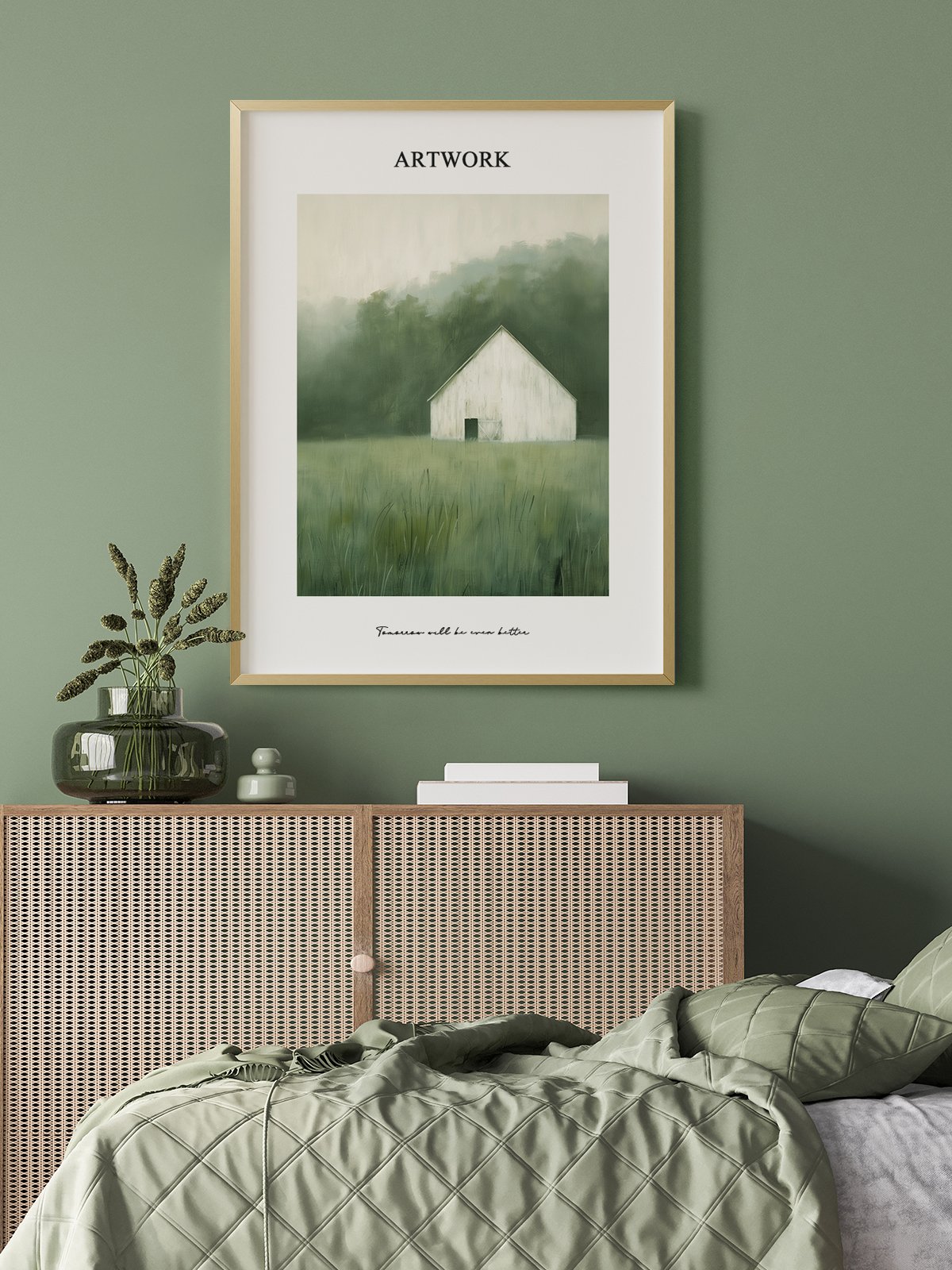 This artwork features a solitary white casa de pie in a mist-covered green field, with exuberante woods in the fondo. The suave tones and delicados brushstrokes crear a serene and peaceful atmosphere. This piece evokes a sentido of calm and tranquilidad, as if one is immersed in a hopeful and quiet pastoral escena.