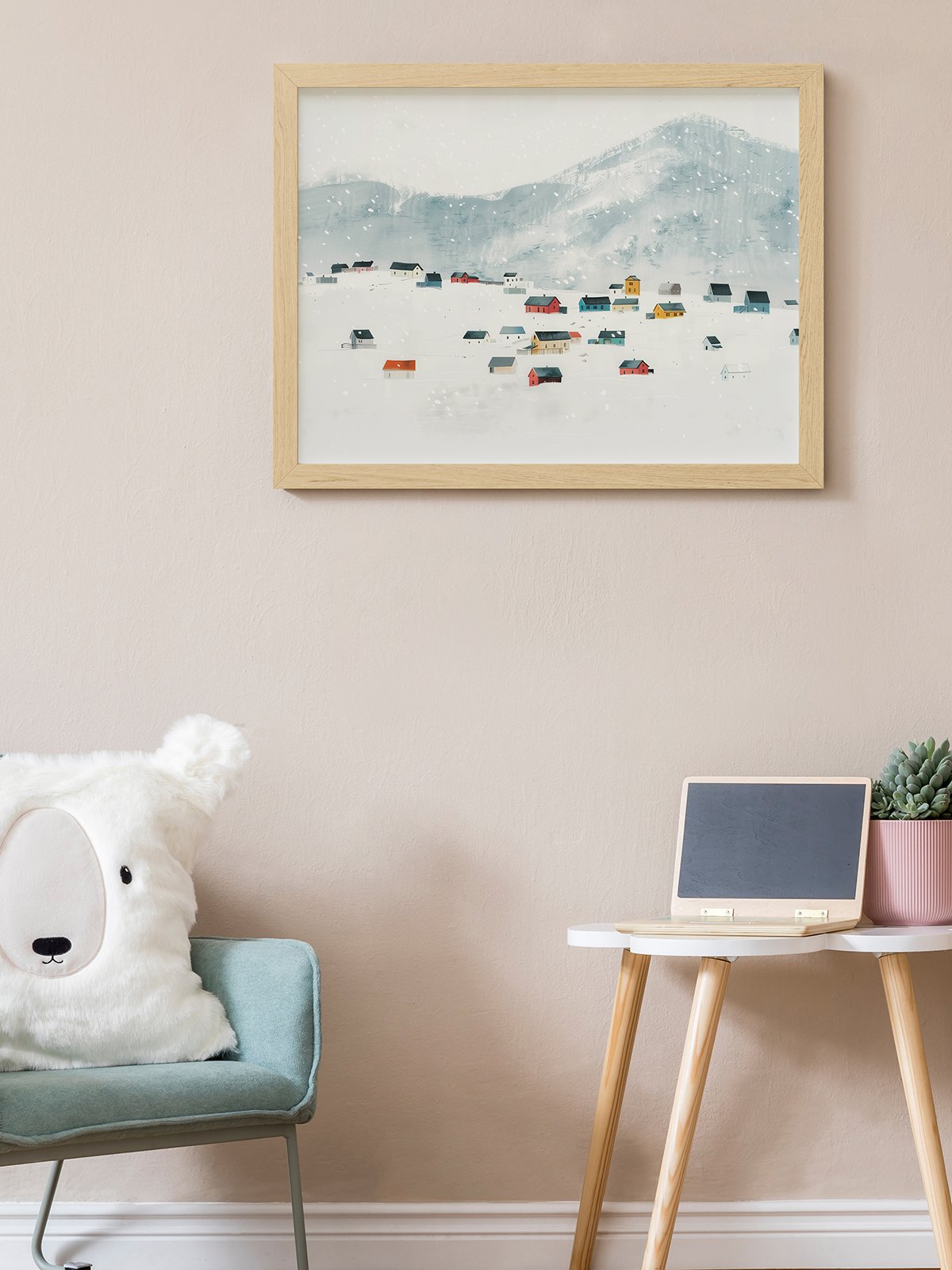 This image representa a tranquil snowy escena with colorful houses scattered on a snow-covered hillside. The escena is fresh and gives a sentido of paz and serenidad, as if you can oír the gentle sound of snowflakes falling.